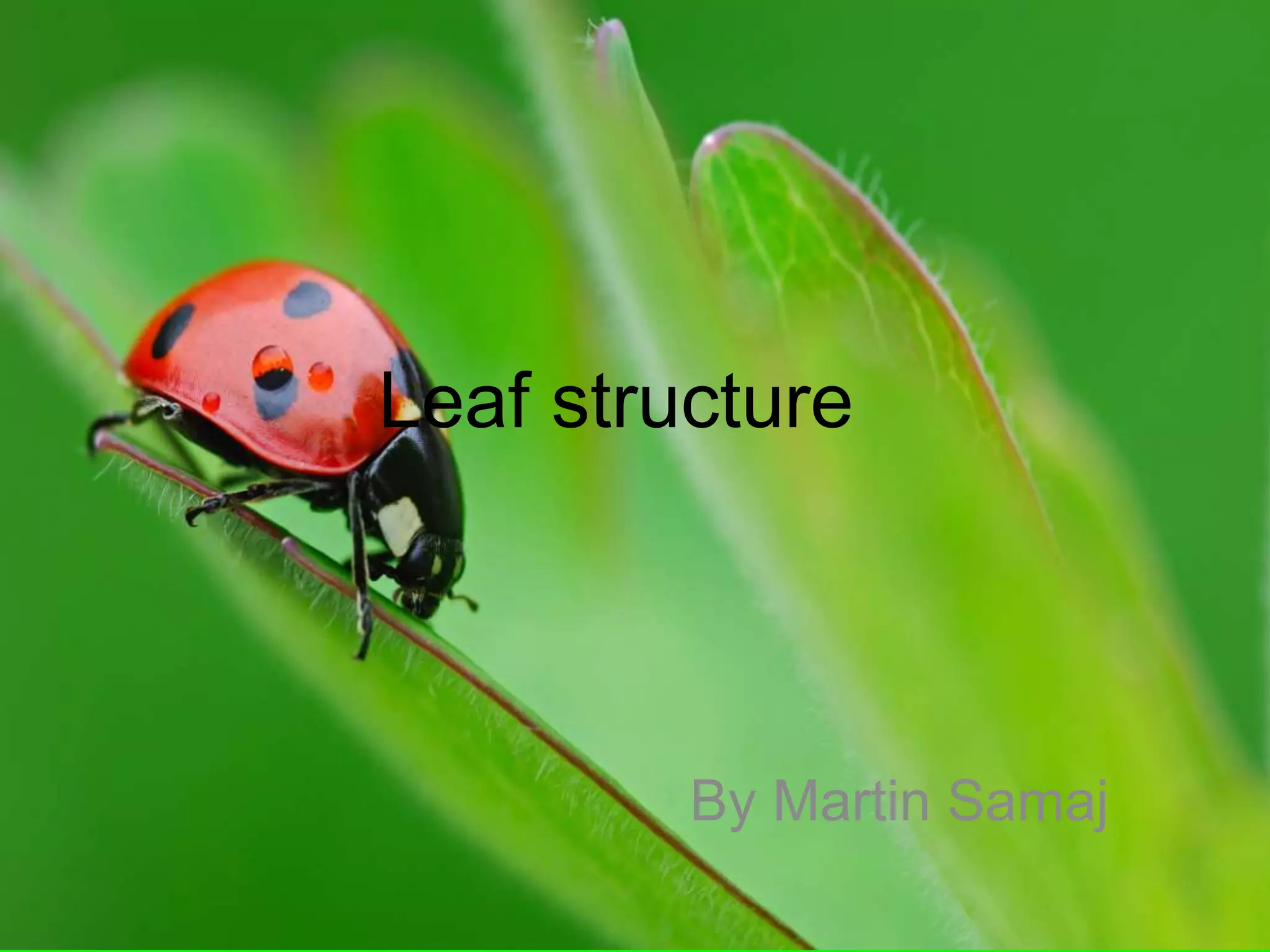 Leaves are specialized plant organs for photosynthesis. They consist of a petiole, lamina, epidermis, and mesophyll tissue. The epidermis is the outer layer that covers and protects the inner tissues. The mesophyll contains two types of tissues - palisade mesophyll with densely packed cells for photosynthesis, and spongy mesophyll with loosely packed cells that provide a surface for gas exchange. Transpiration is the process where water evaporates from the leaf surface and is an important part of photosynthesis, but the rate of transpiration is affected by environmental factors like light, temperature, humidity, and wind.