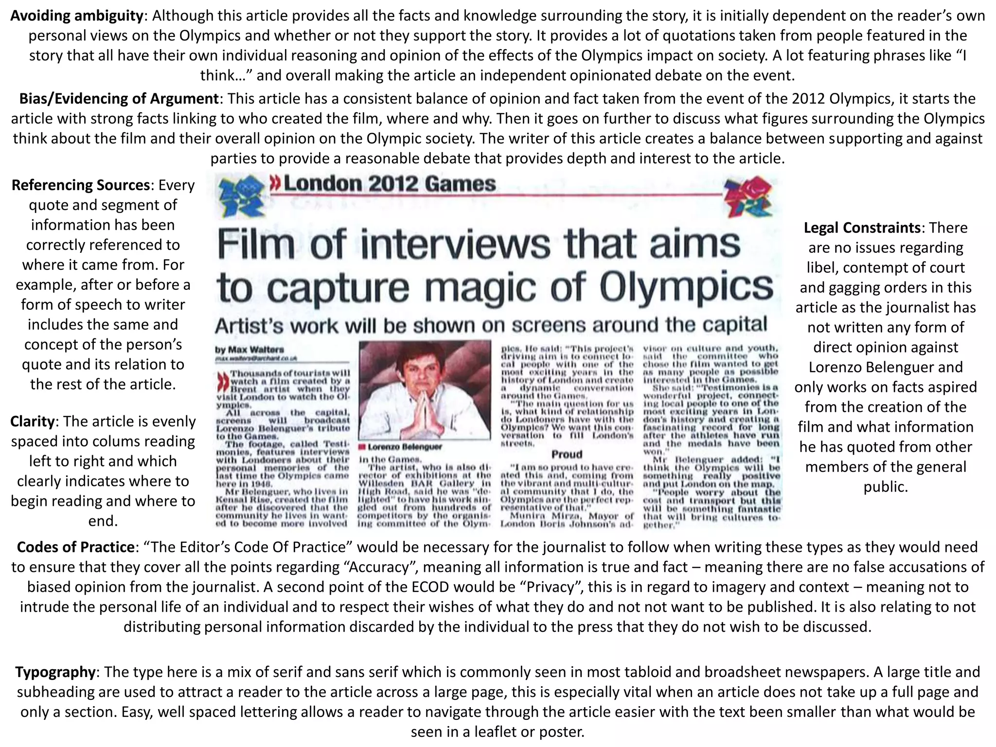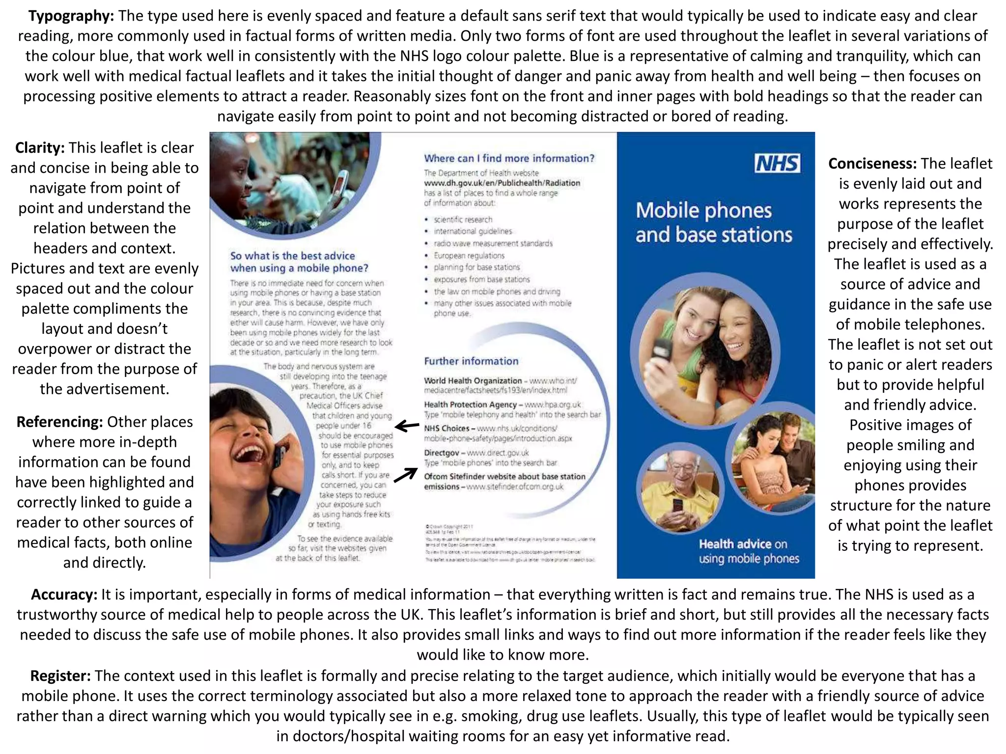 The document discusses the typography, layout, and design elements used in an NHS informational leaflet. It notes that a sans serif font is used to indicate clear reading and that only two fonts are used throughout in variations of blue, which works well with the NHS color palette and conveys calmingness. Reasonably sized fonts are used on front and inner pages with bold headings to help the reader navigate. Pictures and text are evenly spaced and don't distract from the purpose of providing information. References to other sources of information are also included to guide readers.