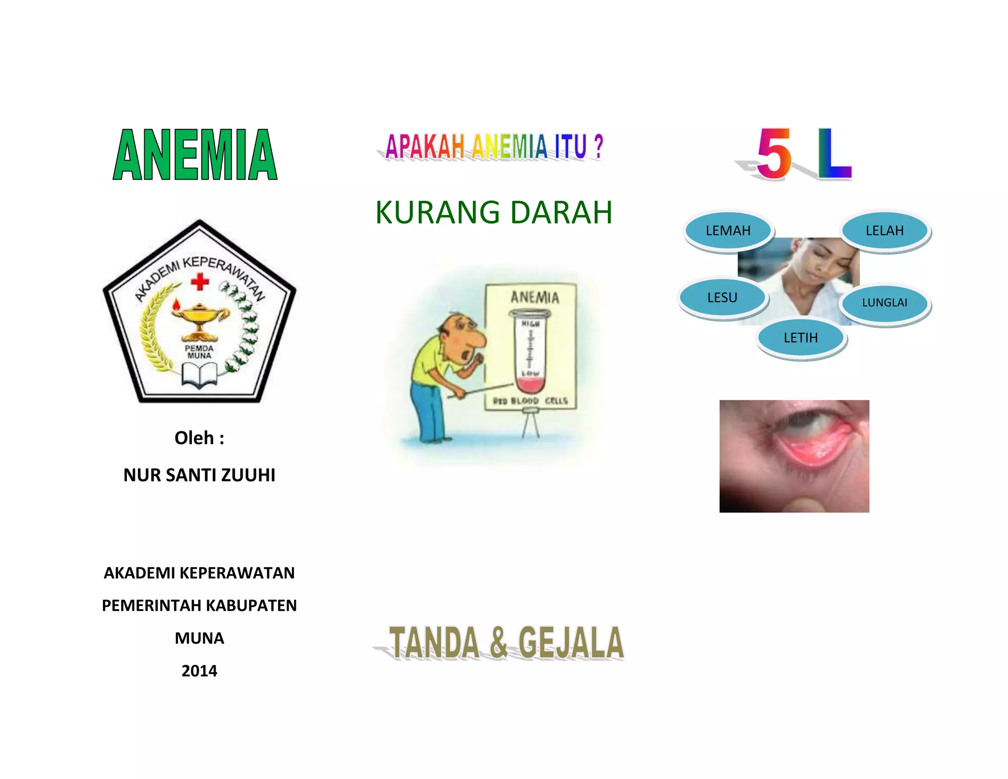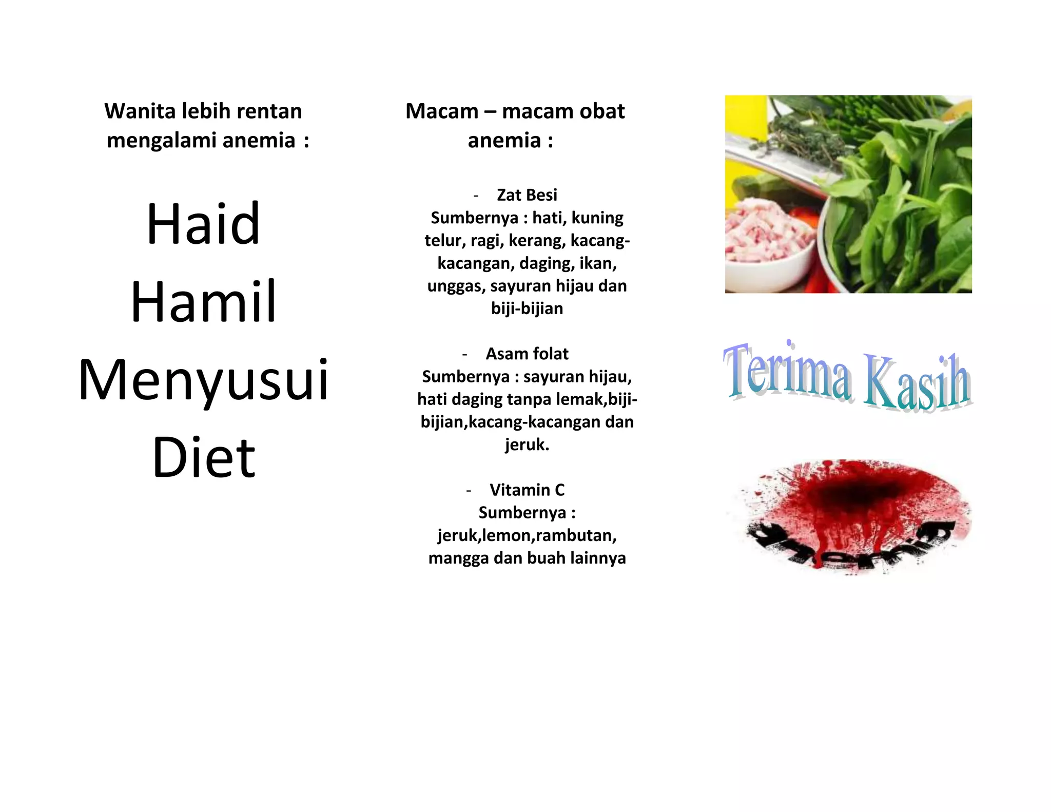 Dokumen ini membahas tentang gejala dan penyebab anemia serta macam-macam sumber zat besi, asam folat, dan vitamin C yang dapat mencegah dan mengobati anemia. Wanita rentan mengalami anemia karena haid, kehamilan, menyusui, dan diet yang kurang seimbang. Zat besi ditemukan dalam hati, telur, ragi, kerang, kacang-kacangan, daging, ikan, unggas dan sayuran hijau. Asam folat dan vitamin C