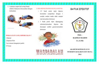 Batuk efektif adalah metode batuk yang efektif untuk mengeluarkan dahak dan melatih otot pernafasan. Metode ini berguna untuk mengeluarkan sekret di saluran pernafasan penderita penyakit paru seperti COPD dan asma, serta pasien bedrest atau pasca operasi. Caranya dengan menarik nafas dalam-dalam lalu mengeluarkan dengan kuat sambil mengangkat bahu untuk memperlancar aliran dahak.