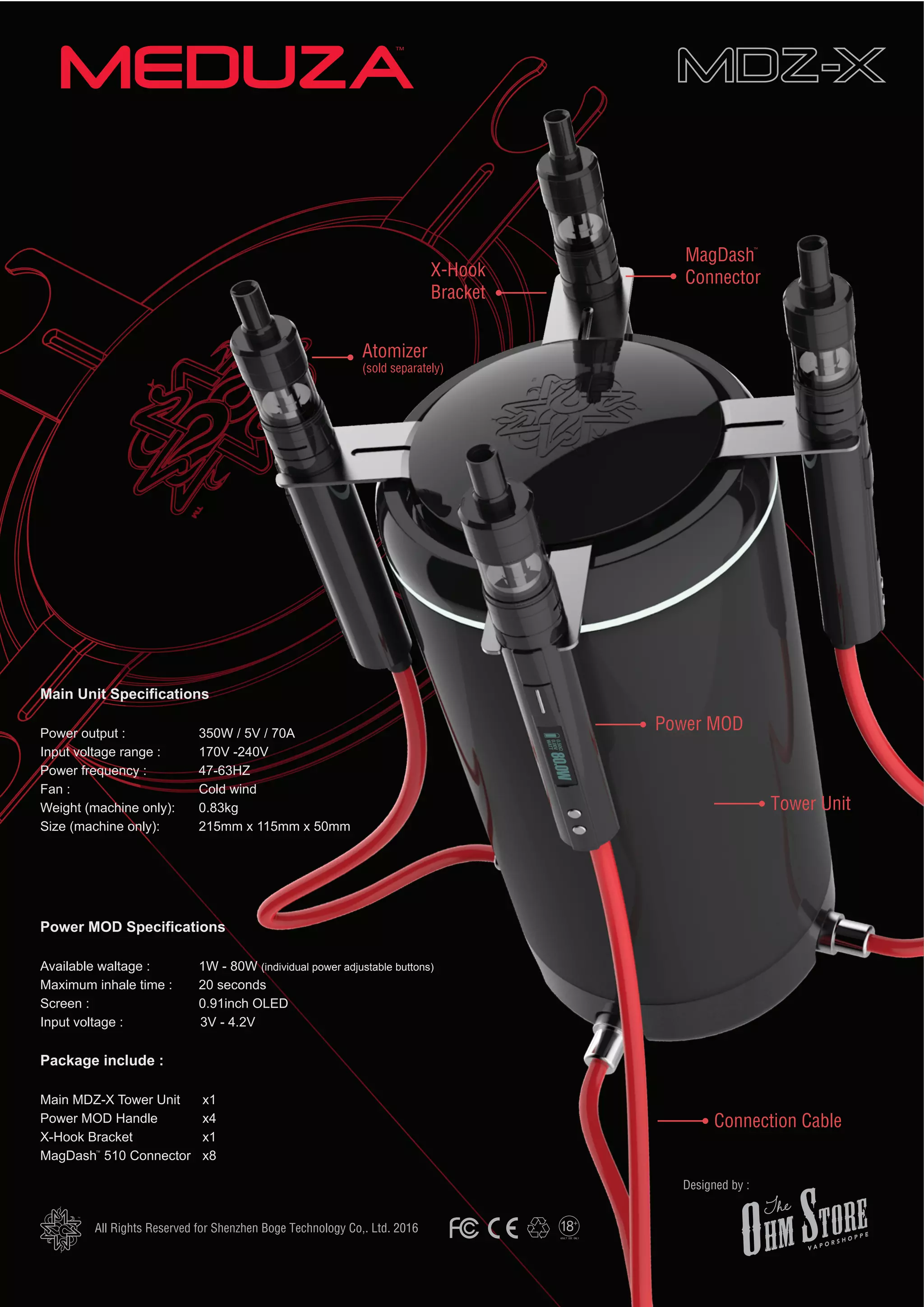 The document provides specifications for a main unit and power MOD for an electronic cigarette. The main unit has a 350W power output with an input voltage range of 170-240V and power frequency of 47-63Hz. It weighs 0.83kg and measures 215mm x 115mm x 50mm. The power MOD has an adjustable wattage from 1W to 80W, a maximum inhale time of 20 seconds, and an OLED screen running on a 3V to 4V input voltage. The package includes one main unit, four power MOD handles, one X-hook bracket, and eight MagDash connectors.