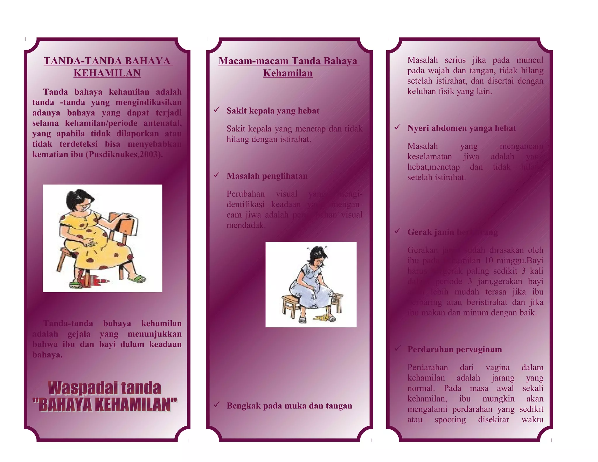 Tanda-tanda bahaya kehamilan mengindikasikan situasi yang dapat membahayakan ibu dan janin, seperti sakit kepala hebat, masalah penglihatan, nyeri abdomen, gerak janin berkurang, perdarahan pervaginam, bengkak pada muka dan tangan, serta kejang. Gejala-gejala ini perlu dilaporkan untuk mencegah potensi kematian ibu. Ibu hamil yang sehat berkontribusi pada kesehatan bayi.