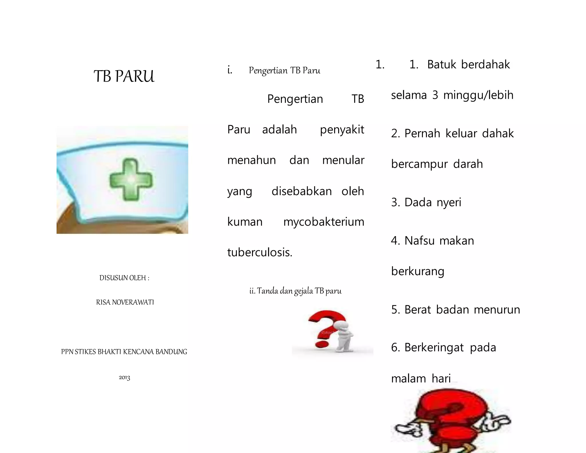 Dokumen ini membahas tentang penyakit TB Paru yang disebabkan oleh kuman Mycobacterium tuberculosis, dengan gejala utama batuk berdahak lebih dari 3 minggu dan pernah keluar darah. Penyebabnya adalah kuman tuberkulosis yang berkembang biak di paru-paru dan menimbulkan infeksi, tergantung dari daya tahan tubuh dan lingkungan. Pencegahannya meliputi menutup mulut saat batuk, pola makan sehat, dan imunisasi BCG