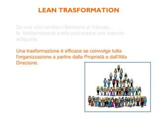 La trasformazione snella è una risposta adeguata a cambiamenti nei riferimenti di mercato. È efficace solo se coinvolge tutta l'organizzazione, a partire dalla proprietà e dall'alta direzione. Il manager deve agire come attivatore e sostenitore del processo, promuovendo il successo attraverso il coinvolgimento delle persone.