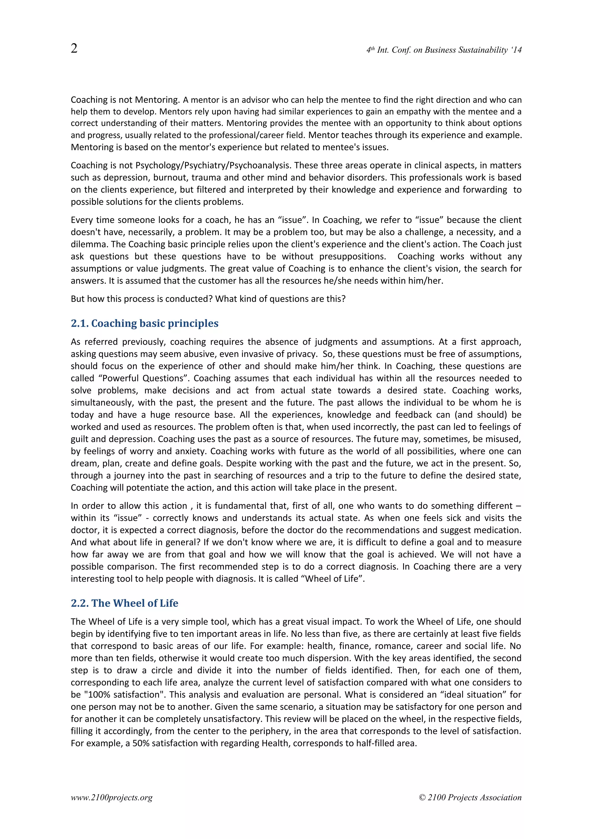 This document discusses Lean Coaching, which combines Lean principles with coaching methods. It introduces the Wheel of Life coaching tool to help individuals diagnose their current "as is" state by assessing satisfaction levels across important life areas. This identifies waste. The Harada Method then helps set goals and daily tasks to create value and agility by moving from the current to the desired "to be" state. Combining the Wheel of Life, Harada Method, and coaching supports continuous improvement by reducing waste and increasing value through focused action.