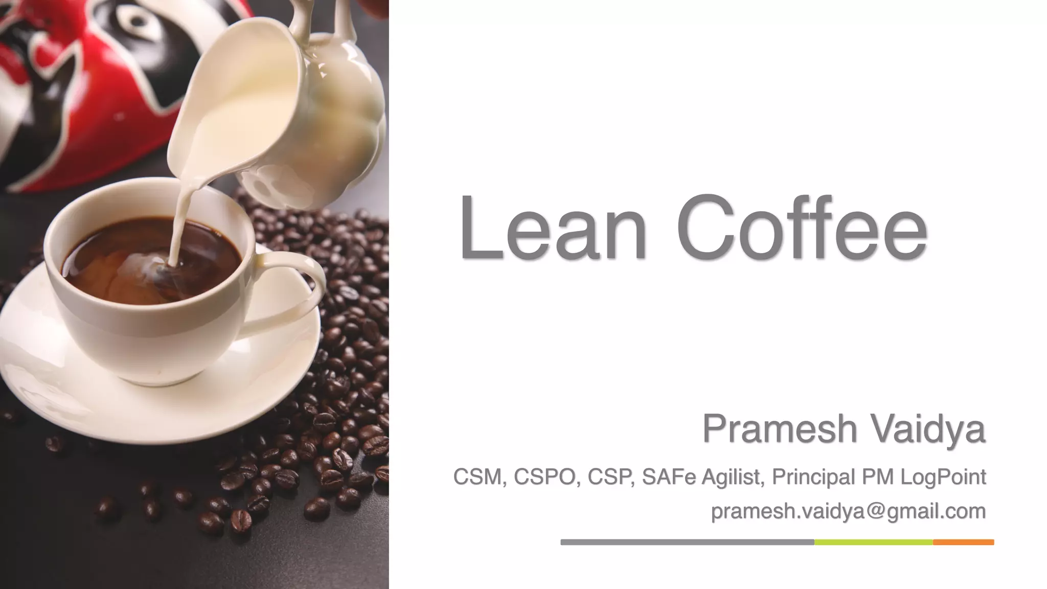 Lean Coffee is a structured yet agenda-less meeting where participants gather and democratically generate the agenda for the meeting. Participants then begin conversations that are directed and productive based on the generated agenda. It works by having participants build the agenda together and direct conversations based on the items on the agenda.
