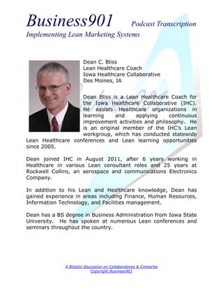 The document is a podcast transcription featuring Dean Bliss, a lean healthcare coach discussing the implementation of lean systems in healthcare through the Iowa Healthcare Collaborative. Bliss shares insights on his experiences and initiatives aimed at improving quality, efficiency, and safety in healthcare by engaging various hospitals in continuous improvement practices. He emphasizes the complexity of the healthcare system, the need for interdisciplinary collaboration, and the importance of adapting lean methodologies to suit the unique challenges faced in this sector.