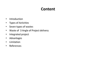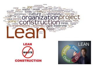 The document discusses lean construction as a methodology focused on minimizing waste and maximizing value in project delivery, particularly in the construction industry which has lagged in productivity improvements. It outlines the seven types of waste, benefits such as reduced costs and increased safety, as well as drawbacks like the need for cohesive teamwork and potential morale issues during implementation. It emphasizes the importance of effective management and communication with stakeholders to successfully adopt lean practices.