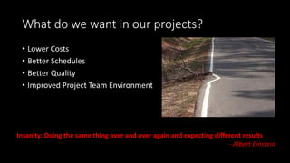 Lean construction aims to transform project management by removing waste and improving productivity, quality, schedules and costs. It draws from lean manufacturing principles to minimize non-value adding activities through tools like target value design, pull scheduling using the Last Planner System, and building information modeling (BIM). Integrated project delivery brings project teams together early through lean contracts to collaboratively design-to-budget and optimize the whole project, rather than sub-optimizing parts. This new approach requires transforming project culture from adversarial to relational and focusing on customer value and continuous improvement.