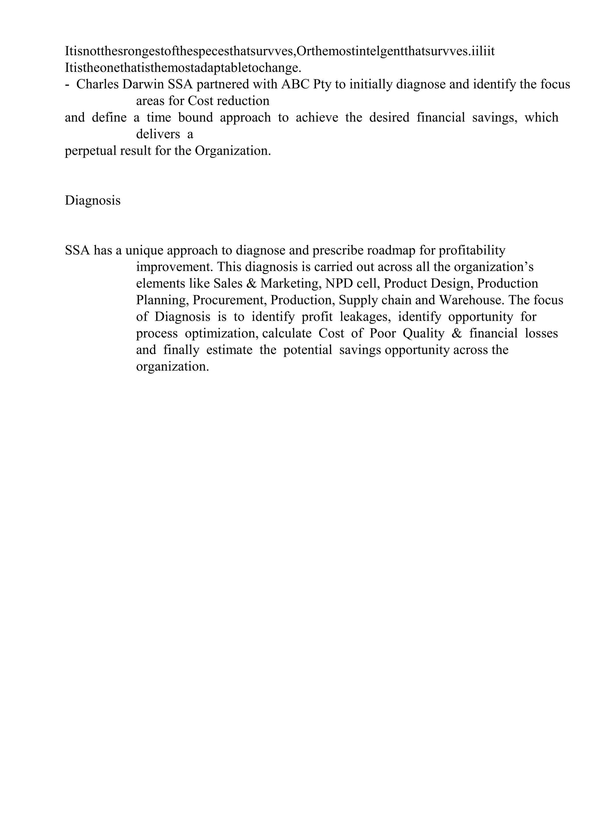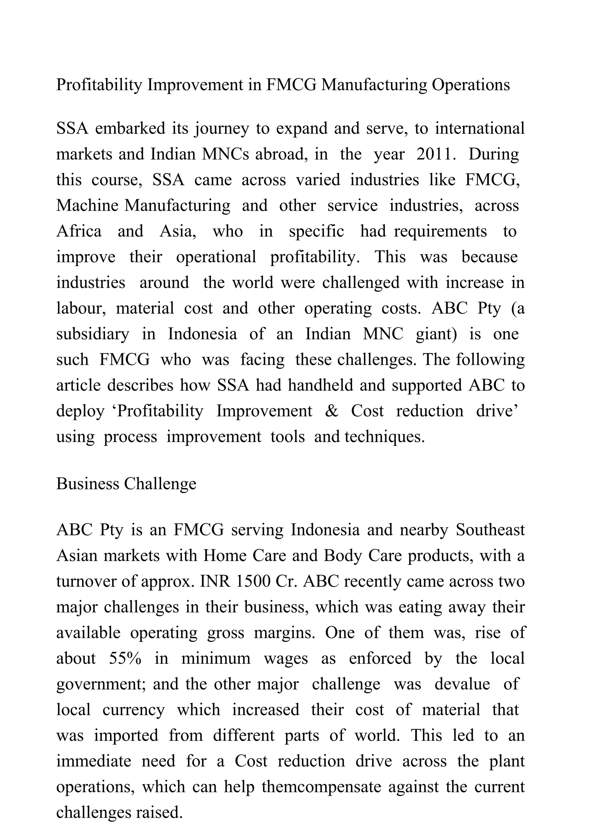 The document discusses how SSA partnered with ABC Pty, an Indonesian subsidiary of an Indian FMCG company, to improve profitability and reduce costs. ABC was facing rising costs from increased minimum wages and currency devaluation. SSA conducted a diagnosis across ABC's operations to identify profit leaks and savings opportunities. They then deployed a three-pronged approach using Lean Manufacturing, DMAIC problem solving, and Total Productive Maintenance on 13 of ABC's production lines to eliminate waste and improve productivity in order to achieve financial goals and offset rising costs.