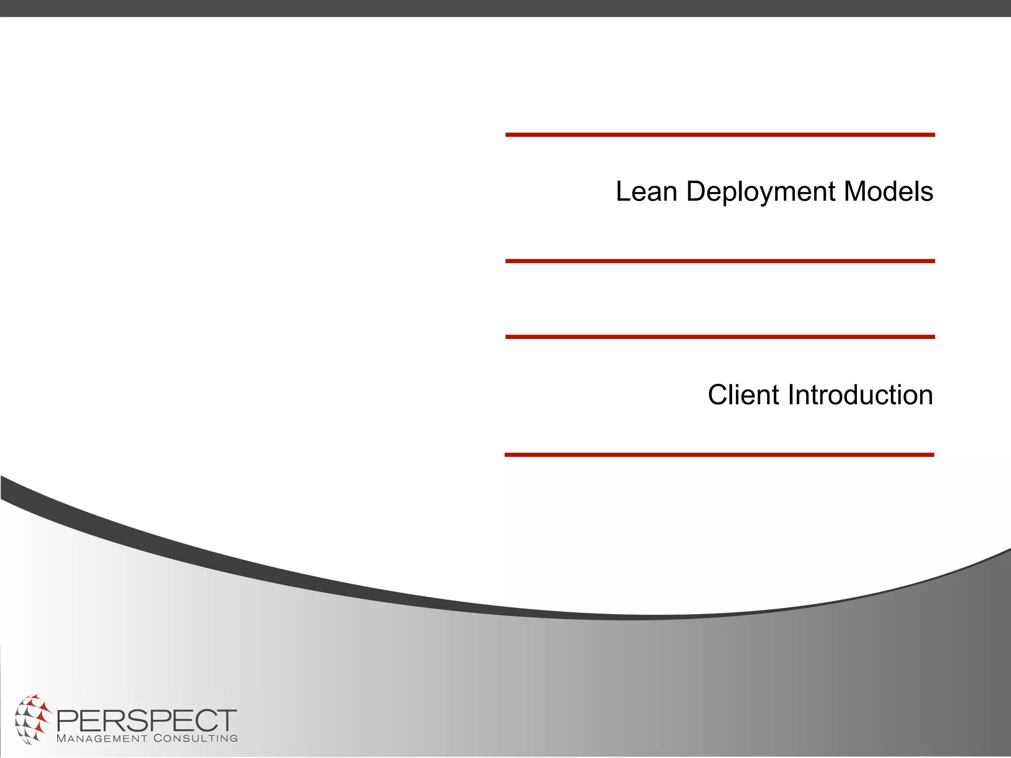 The document outlines various lean deployment models focusing on factors to consider during the process, including goals, models, infrastructure, and metrics for success. It describes different approaches such as enterprise-wide, department-focused, targeted, and grassroots models, each with unique characteristics and potential challenges. Additionally, it emphasizes the importance of leadership, sustainability, and integrating lean initiatives into organizational systems.