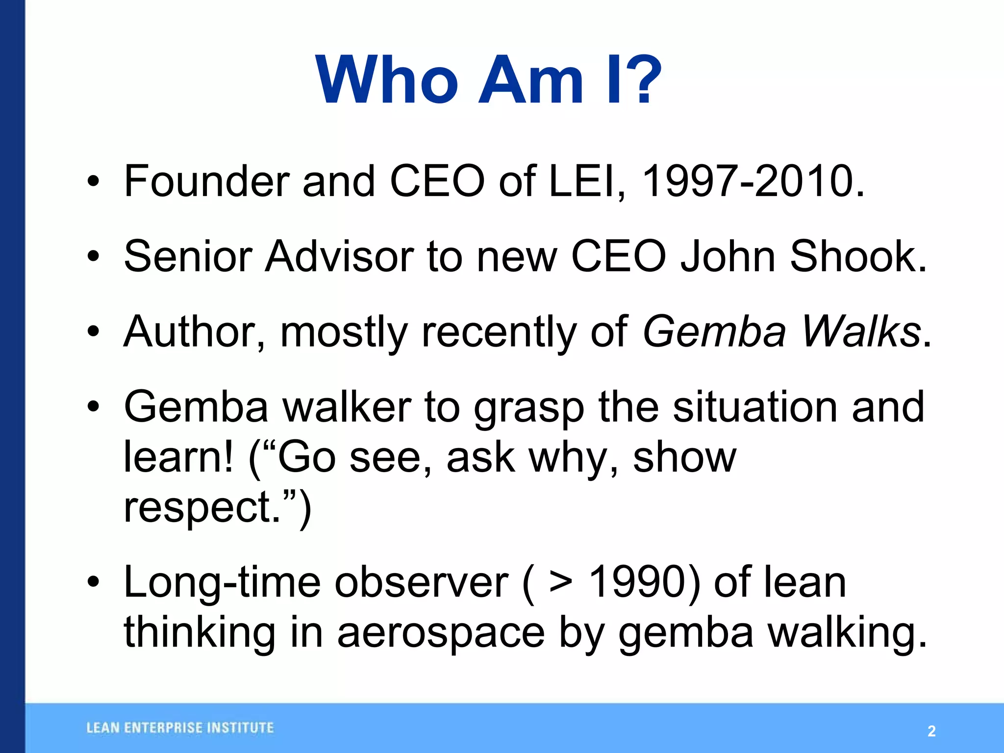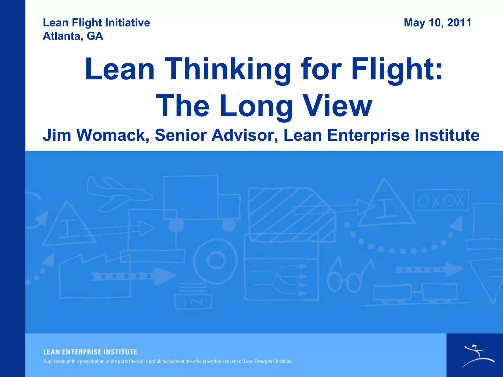 The document discusses the history and current state of lean thinking in aerospace, highlighting a disconnect between available lean tools and management practices. It emphasizes that lean management is essential for maximizing the benefits of these tools and that numerous experiments are needed to integrate lean practices fully. The Lean Flight Initiative aims to address these challenges by promoting collaboration and sharing experimental findings among stakeholders.