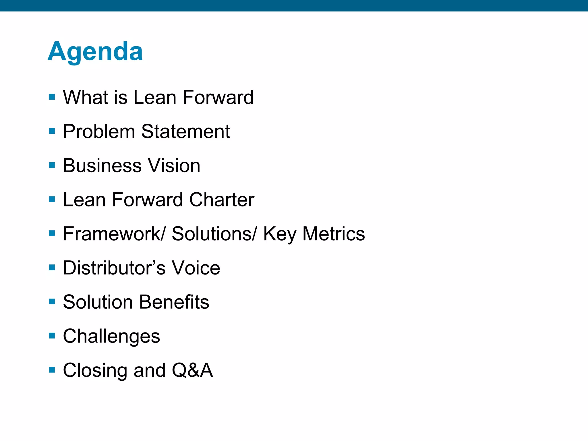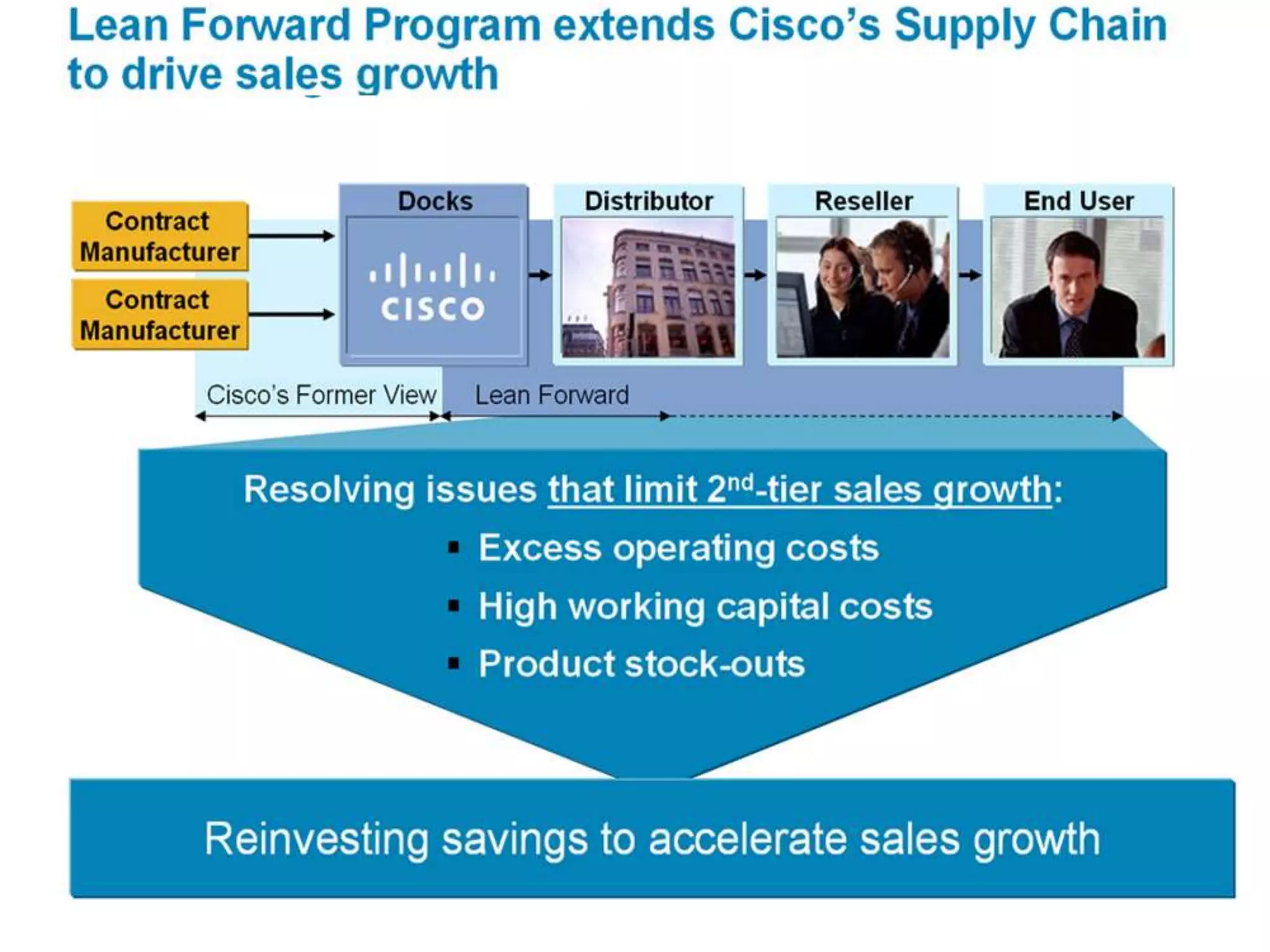 The document discusses Cisco's 'Lean Forward' initiative aimed at enhancing profitable growth and sales acceleration by extending lean manufacturing principles into its distribution channels. It identifies challenges such as high operating costs and unpredictable lead times, and outlines a collaborative framework involving supply chain management and various stakeholders. Key benefits include improved supply chain visibility, streamlined processes, and mutual profitability for Cisco and its distributors.