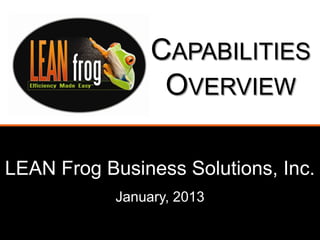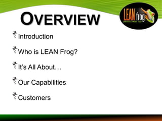 LEAN Frog Business Solutions is a Huntsville, Alabama-based company established in 2009 that provides human resources, organizational development, Lean Six Sigma, and technical support services to a variety of industries. It has 10 employees and 2 contractors with expertise in public education, manufacturing, government, finance, and strategic communication. The company promotes operational excellence, high performing teams and organizations, and helping customers manage their organizational lifecycle.