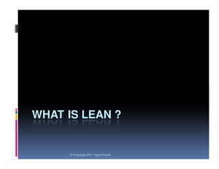 Lean is a management philosophy focused on improving processes by eliminating waste and maximizing customer value with fewer resources. Originating from the Toyota Production System, it identifies types of waste and employs principles such as mapping the value stream and implementing pull systems to enhance efficiency. The ultimate goal of lean is continuous improvement and delivering exactly what customers want while reducing costs and increasing satisfaction.