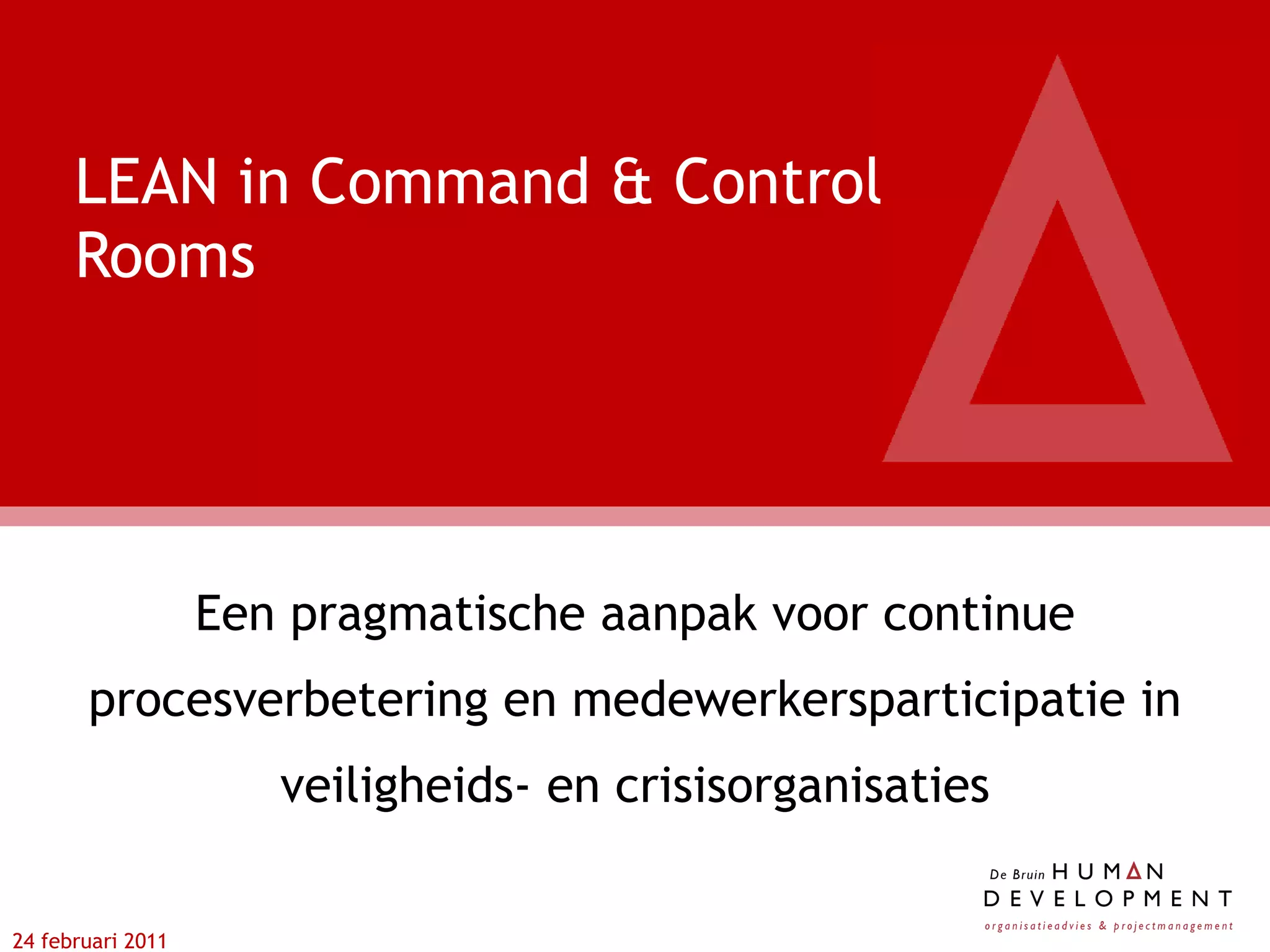 Hoe nu verder?In deze presentatie is op hoofdlijnen beschreven wat LEAN management is en wat de kansen en risico’s zijn bij toepassing binnen Command & Control Rooms Wilt u meer weten over mogelijke proces- en organisatie-verbeteringen in uw organisatie, neem dan gerust en vrijblijvend contact op met De Bruin HUMAN DEVELOPMENT. LEAN Management is één van de vele mogelijke aanpakken voor (continue) verbetering. Onze kennis en ervaring kunnen u helpen bij het kiezen van de aanpak die in uw situatie het beste past. 24 februari 2011