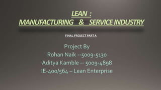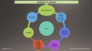 The document discusses lean manufacturing principles and their application in both manufacturing and service industries, highlighting the seven types of waste: overproduction, defects, inventory, over-processing, transportation, waiting, and motion. It contrasts lean practices in companies like Boeing and Motorola while emphasizing the importance of efficiency, quality improvement, and cost reduction. Additionally, it suggests that lean can be applied broadly as a business strategy to enhance profitability.
