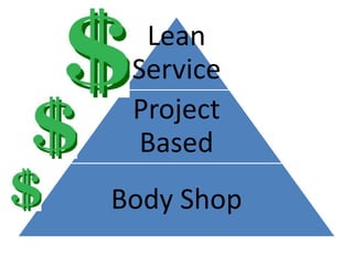 Документ обсуждает применение методологии бережливого производства (lean) в офшорной разработке, рассматривая ключевые принципы, стратегии и потенциальные проблемы, которые могут возникнуть. Основное внимание уделяется созданию команды, ориентированной на качество и эффективность, а также взаимодействию с заказчиками для минимизации потерь и максимизации ценности. Обсуждаются методы, такие как kanban и scrum, и подчеркивается важность долгосрочного успеха и обучения сотрудников.
