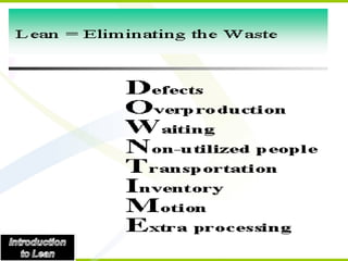 The document discusses key concepts in lean manufacturing including the four basic lean principles of eliminating waste, increasing speed and response, improving quality, and reducing costs. It provides examples of business processes in different functional areas like manufacturing, human resources, finance, and sales. It also explains the differences between push and pull systems, with pull systems synchronizing production to customer demand to minimize inventory.
