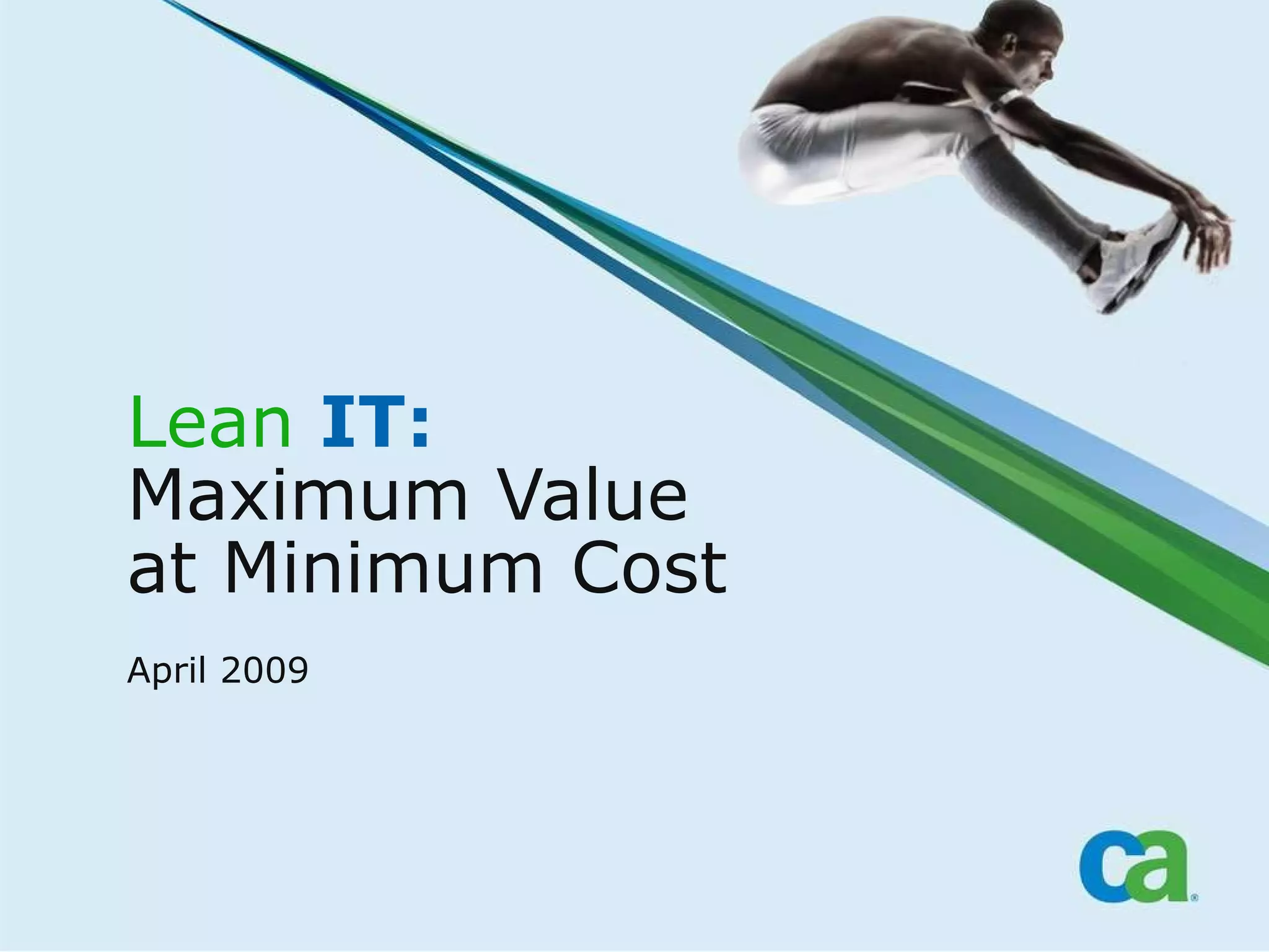 The document discusses the concept of "Lean IT", which aims to deliver maximum value to customers at minimum cost by focusing IT resources on high-value activities and reducing waste. It describes how CA's Enterprise IT Management (EITM) solutions can uniquely enable Lean IT by visualizing, automating, and optimizing IT systems and processes from the data center to the customer. The EITM solutions span six disciplines: application performance management, service management, project and portfolio management, infrastructure management, security management, and mainframe management.