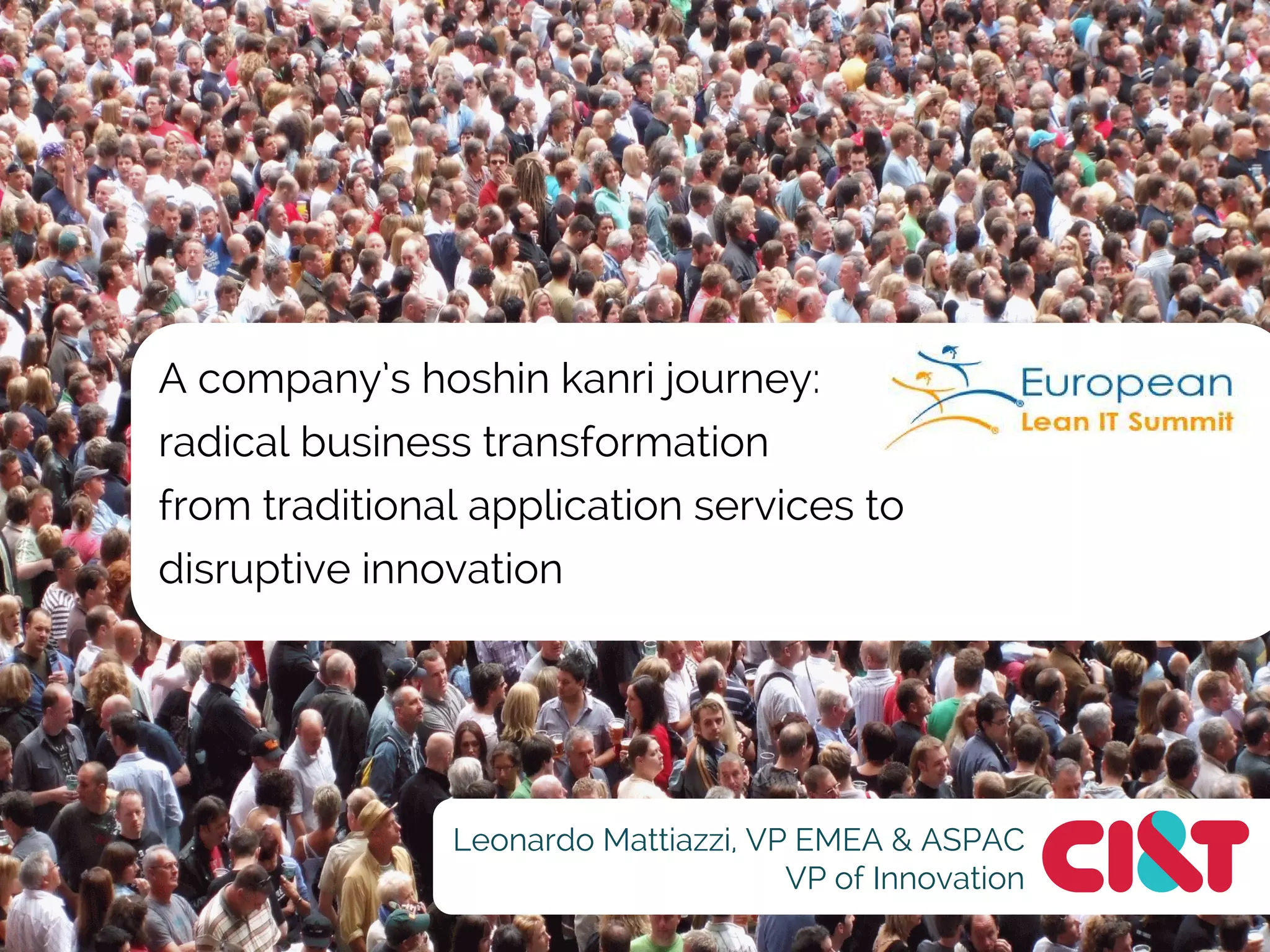 A company underwent a radical business transformation from traditional application services to disruptive innovation using a hoshin kanri approach. Goals were set to increase leader maturity and reduce fixed costs. Countermeasures included leadership training, a technical training office, and a fixed cost deep dive. Both continuous improvement (kaizen) and radical change (kaikaku) approaches were used. Innovation was defined as solving unknown problems and could not wait a year. Drivers included non-linear growth goals and increased competition threatening their sweet spot. Tools from lean were used in a portfolio approach to innovation, including rapid testing of prototypes rather than emulating startups. Results included disruptive strategies in new markets and regions. Benefits included intensive learning, conversations