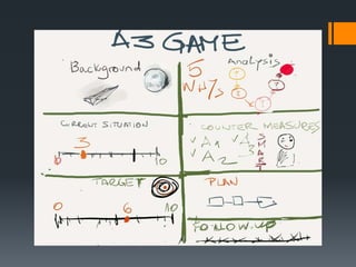 This document outlines an activity using the A3 problem solving tool to help groups reach the goal of getting to the moon in 10 rounds. It describes the current status of groups of 7-10 people building paper planes to reach the target without exceeding 5 minutes for the first round and provides tips for the second and third rounds such as checking plans are SMART, following the plan, collecting and tracking data, and using data from previous rounds to validate assumptions. A debrief follows the activity.