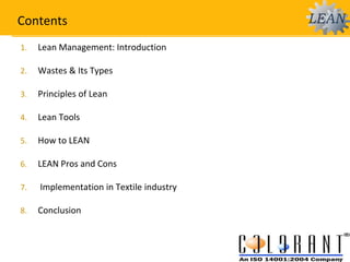 The document presents lean management concepts applied to the textile industry, emphasizing the identification and elimination of waste to improve efficiency and reduce costs. It details various types of waste, lean principles, and tools, as well as how lean practices can benefit both manufacturing and service-oriented businesses. The conclusion highlights that lean is a comprehensive approach impacting all organizational levels, aimed at delivering value by minimizing waste.