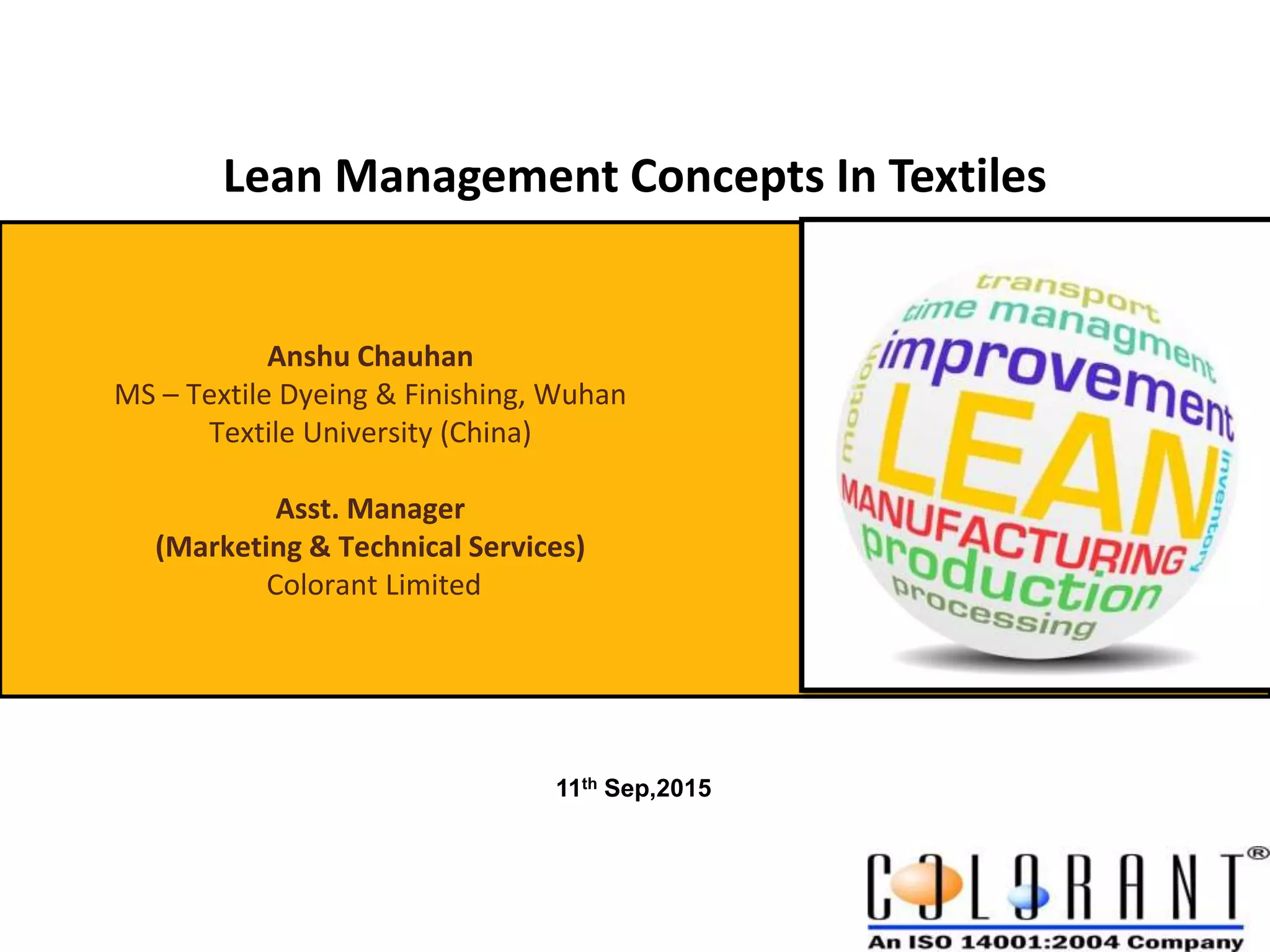 The document presents lean management concepts applied to the textile industry, emphasizing the identification and elimination of waste to improve efficiency and reduce costs. It details various types of waste, lean principles, and tools, as well as how lean practices can benefit both manufacturing and service-oriented businesses. The conclusion highlights that lean is a comprehensive approach impacting all organizational levels, aimed at delivering value by minimizing waste.