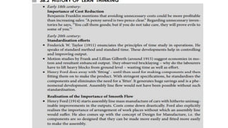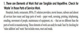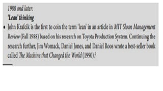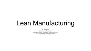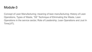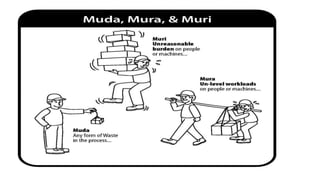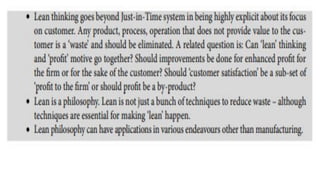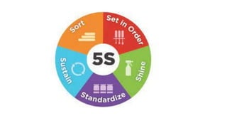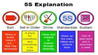 Lean manufacturing aims to maximize productivity while minimizing waste. It focuses on eliminating "muda," or waste, through efficient processes that integrate each production step holistically. The "5S" technique is used to eliminate waste through sorting, systematic organization, sweeping, standardizing, and sustaining clean and organized workplaces. Key aspects of lean include just-in-time production to avoid overproduction and excess inventory, continuous improvement through kaizen, and leadership commitment to instill a culture of waste elimination.