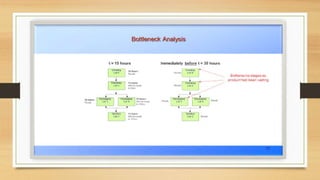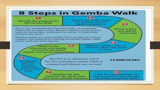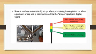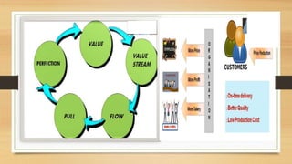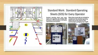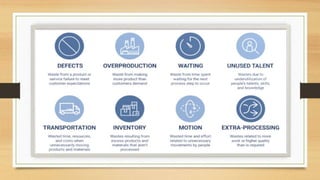 Lean manufacturing aims to reduce waste in production processes. It utilizes tools like 5S to organize workspaces, visual controls for communication, and just-in-time production to minimize inventory levels. Identification and elimination of sources of waste like defects, downtime, and excess inventory are key to improving overall equipment effectiveness through continuous improvement efforts.