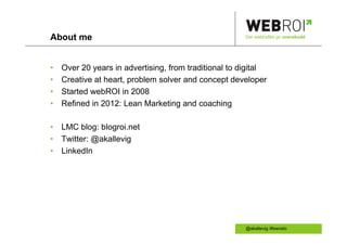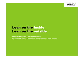 The document discusses lean marketing principles for effective development, authored by Annette Kallevig, a seasoned advertising expert. It outlines a practical approach that includes creating value, continuous improvement, and eliminating waste, with specific steps for implementing a lean marketing strategy. The emphasis is on adaptability, sustainability, and reducing financial risks while focusing on what works best in marketing efforts.