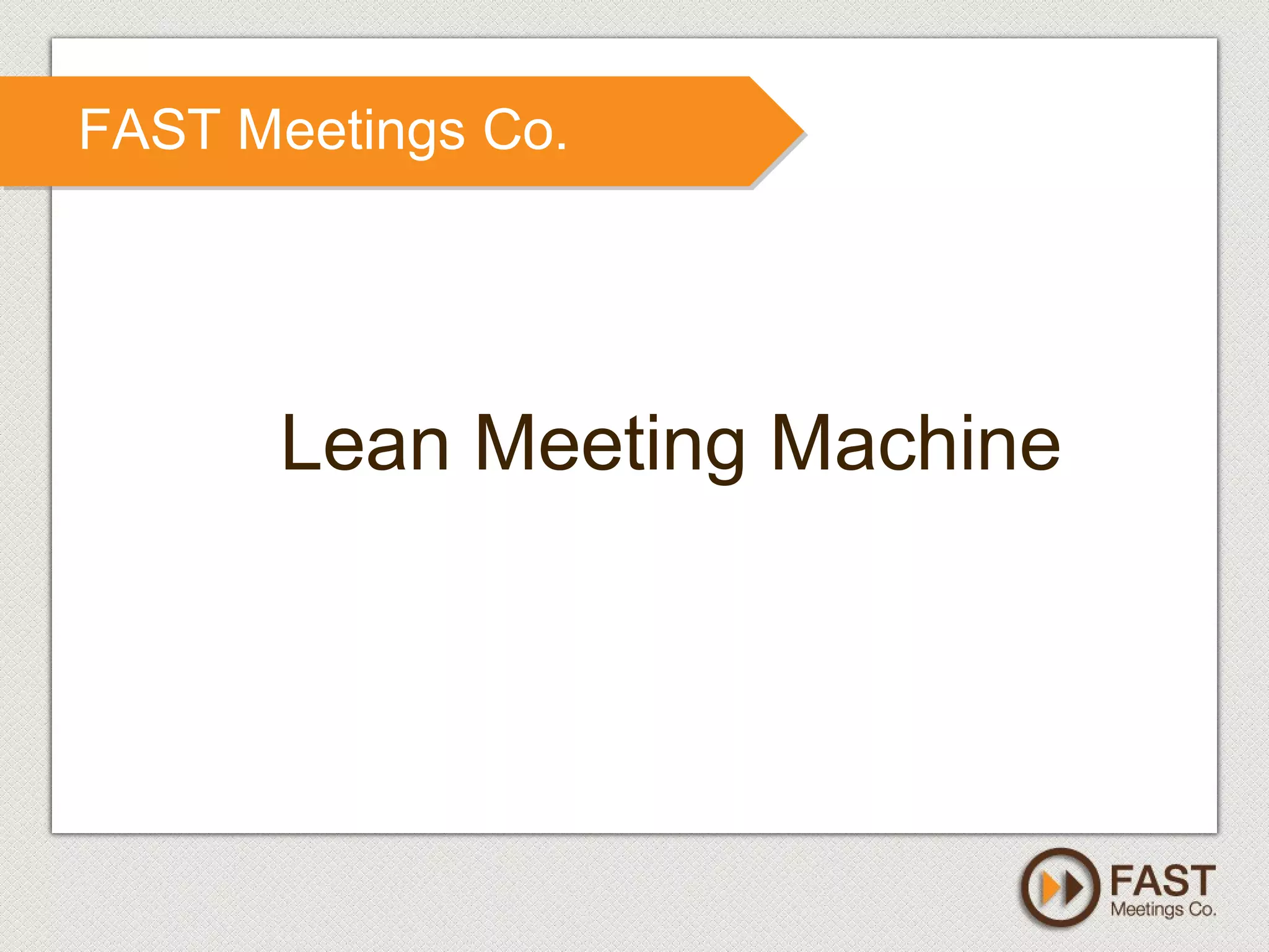 The document outlines strategies for improving meeting effectiveness through the Fast Meetings framework, which emphasizes the importance of defining meeting types, purposes, and participant roles. Key goals include enhancing productivity and accountability within meetings by implementing clear processes and practical actions. It encourages individuals and organizations to adopt specific techniques and tools to facilitate better decision-making and engagement.
