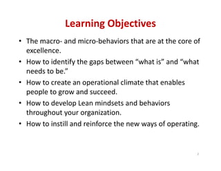 The document outlines strategies for developing lean mindsets and behaviors to foster a high-performance organizational climate that supports continuous improvement. It emphasizes the importance of operational clarity, engagement, focus, and disciplined decision-making processes, as well as the need to proactively manage gaps in organizational behaviors to enhance productivity and results. Key concepts include the strategy deployment method, metrics-based process mapping, and the necessity of process ownership for consistent outcomes.