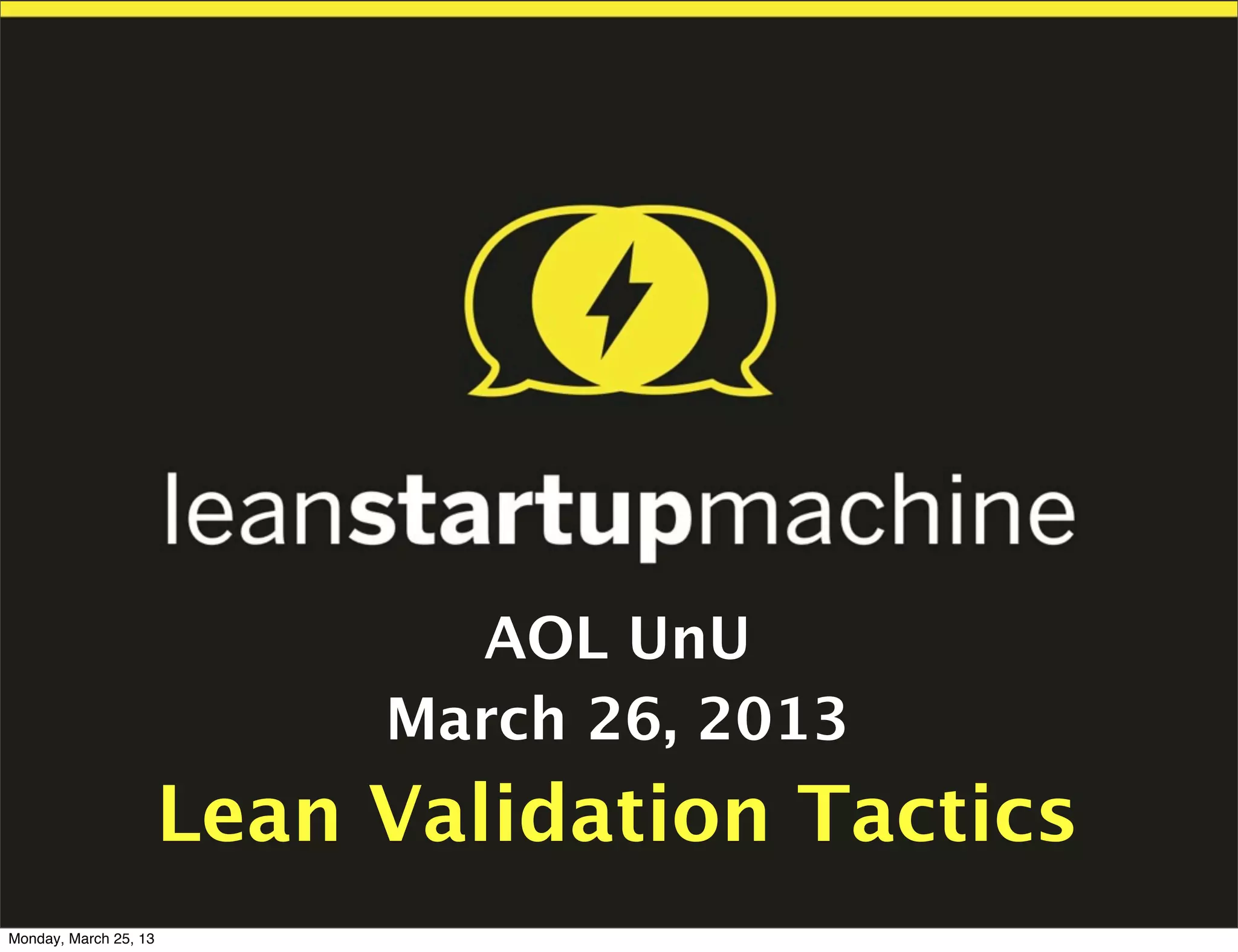 The document discusses lean validation tactics for entrepreneurship and product development, emphasizing the importance of learning about customer needs before creating a product. It outlines five tactics for validation: ads/click-throughs, fake doors, clickable mockups, customer interviews, and recon. The context is provided by mentioning a workshop series by Lean Startup Machine, highlighting its global presence in 2013.