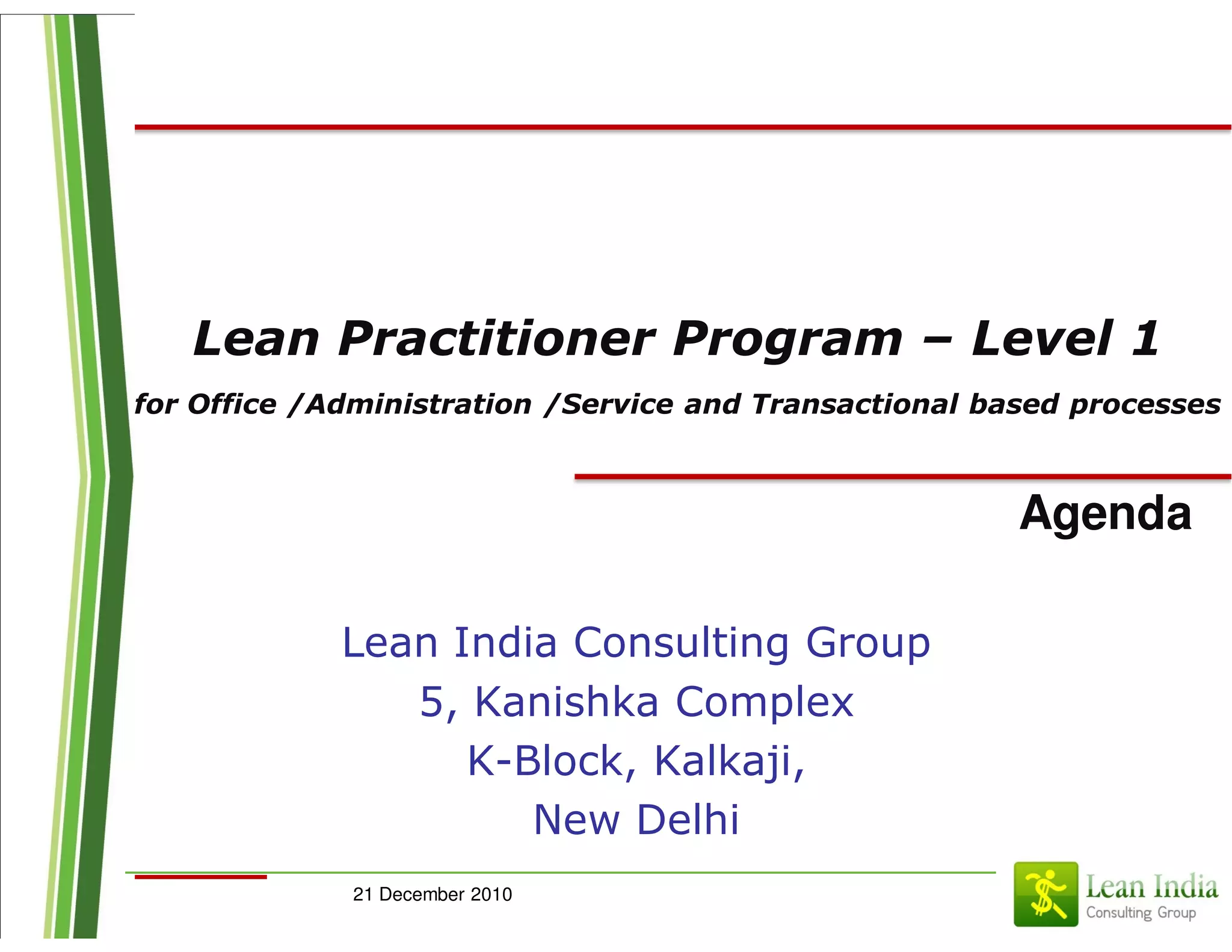 The 3-day Lean Practitioner Program Level 1 focuses on introducing lean principles and tools for office, administration and service processes. The agenda covers lean evolution, value definition, identifying waste, value stream mapping, flow, flexibility and perfection. Participants will learn through simulations, exercises and case studies. They will understand lean principles, be able to diagnose processes and identify improvement projects. Successful participants will receive a Lean Practitioner Level 1 certificate. The goal is to help organizations enhance productivity, quality and reduce costs through lean transformations.