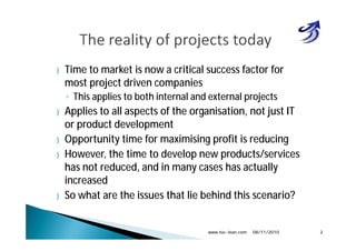 This presentation discusses using Critical Chain Project Management (CCPM) to improve project performance. CCPM identifies the critical chain of dependent tasks and protects it with buffers to accommodate uncertainty. It requires focusing effort on critical chain tasks and subordinating all other work. Examples are given where CCPM has helped organizations increase throughput, reduce cycle times, and improve on-time delivery.