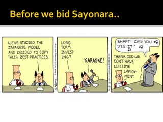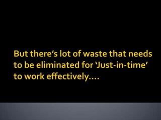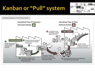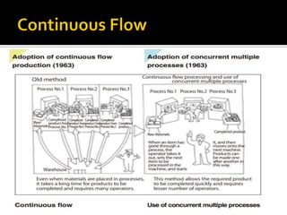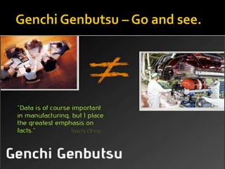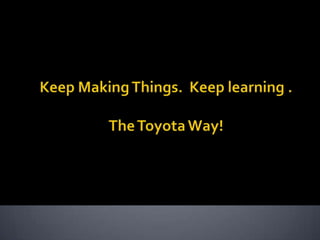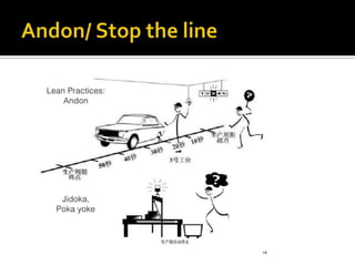 This document discusses key concepts from Toyota's lean production system (TPS). It provides definitions and examples of 11 Japanese terms from TPS that can be applied to improve production and lean processes. These include jidoka (automation with human intelligence), pokayoke (mistake proofing), andon (visual signals for problems), muda (waste), and kaizen (continuous improvement). The document also discusses lean thinkers like Taiichi Ohno, W. Edward Deming and how their work influenced Toyota and lean manufacturing. Overall it presents an overview of lean principles and their origins at Toyota that readers can apply to gain a better perspective on lean.