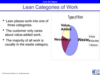 The document explores the principles and practices of Lean Six Sigma, which categorizes work into value-added, necessary, and waste categories, focusing on waste elimination to enhance efficiency. It details seven types of waste, such as overproduction and defects, and emphasizes the importance of processes like Just-In-Time and Pull Systems to streamline operations and reduce excess inventory. Additionally, it highlights the significance of continuous flow and cycle time reduction to optimize production processes and meet customer demand efficiently.