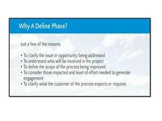This document provides an overview of Lean Six Sigma. It begins with an agenda that outlines understanding Lean Six Sigma, why it is necessary, the eight wastes, and the DMAIC methodology. It then discusses how Lean Six Sigma aims to provide organization-level improvements with reduced resources. Competition is increasing due to advances in technology, so understanding processes is important for competitiveness. The training purpose is to survive in today's economy. Lean focuses on eliminating waste, while Six Sigma aims for precision and reducing defects. Combining the two methodologies provides a comprehensive toolset for process improvement. Key phases of DMAIC (Define, Measure, Analyze, Improve, Control) are outlined for solving problems in a structured way.
