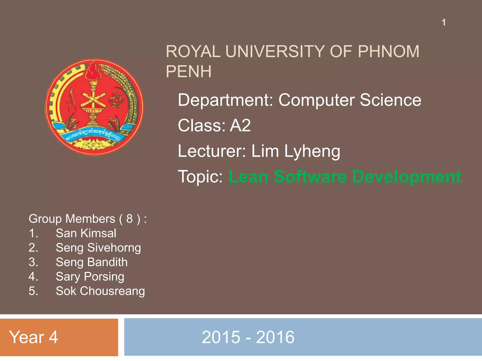 The document presents an overview of lean software development, highlighting its definition, historical background, principles, and tools. It details the advantages and disadvantages of lean methodologies, emphasizing the importance of minimizing waste and enhancing productivity. The conclusion reiterates the core goals of lean software development, which include the elimination of waste and improvements in efficiency and profitability.