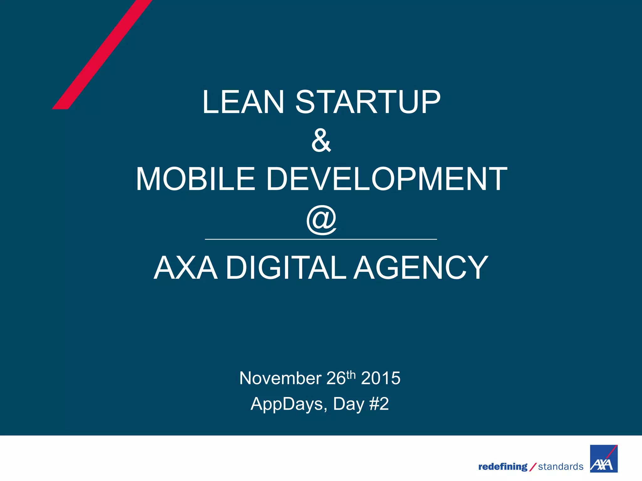 This document outlines the Lean Startup methodology used at AXA Digital Agency for mobile development. It discusses starting with listening to customers to understand their pain points, developing minimum viable products through an agile process, and continuously learning from customer feedback to iteratively improve products. The goal is to discover product-market fit through measuring customer satisfaction, retention, referrals, and growth. In conclusion, it emphasizes focusing on customers and problems first, taking incremental steps with constant iteration, and leveraging technology throughout the process.