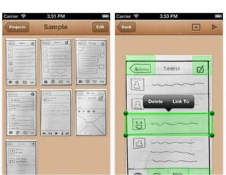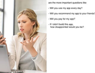 This document summarizes a presentation on lean startup principles for mobile app development. It discusses how most apps get low download numbers and user engagement. It emphasizes building Minimum Viable Products (MVPs) and prototypes to test assumptions through user experiments and feedback, rather than fully developing apps without validation. Specific tips include using paper mockups and photos to quickly prototype apps; gathering blind user feedback; testing in different countries before major launches; and focusing on loops that drive user invite, content creation, and purchases. The document encourages questions and provides contact details.