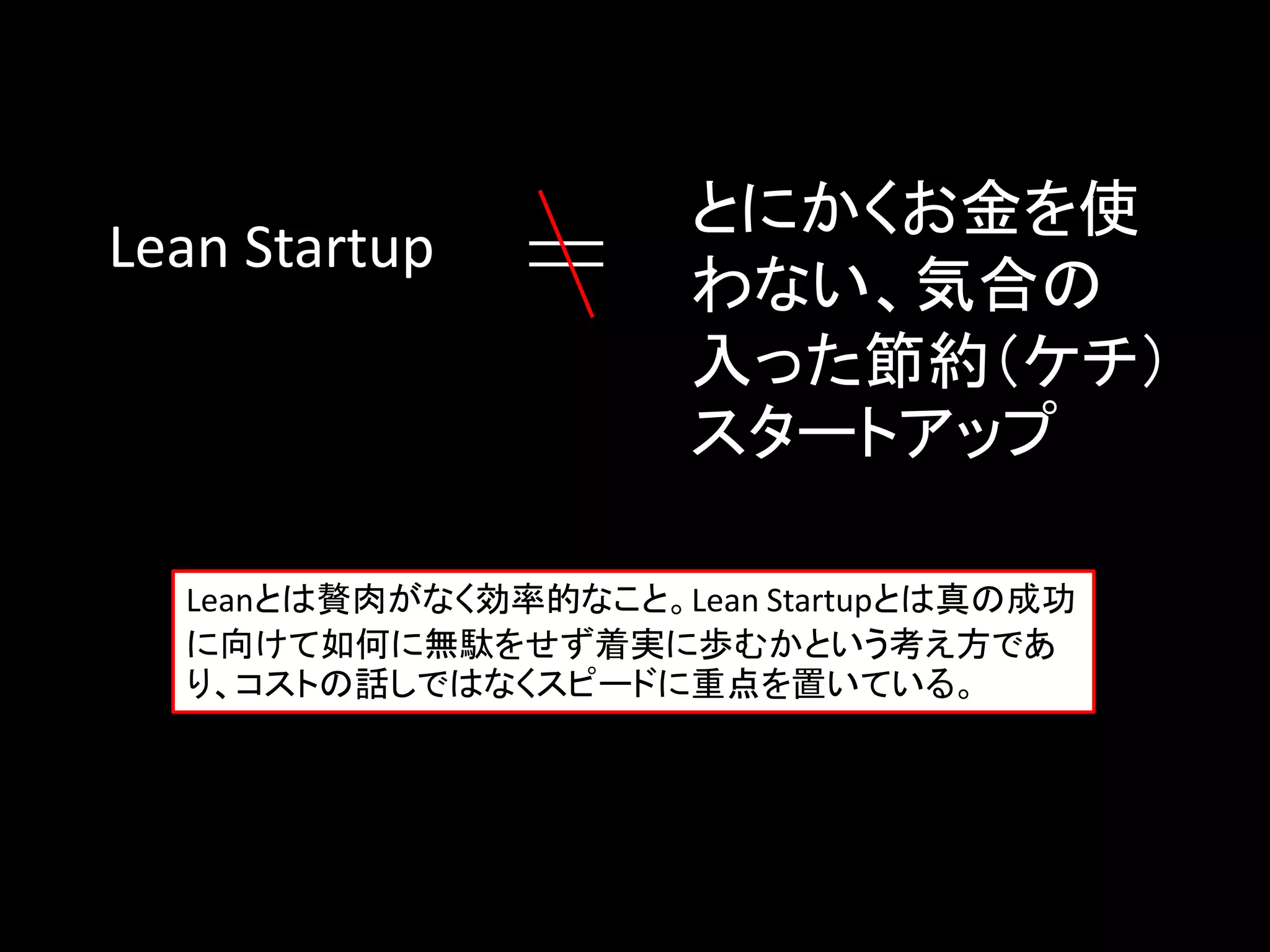 わない、気合の 入った節約(ケチ) スタートアップ Leanとは贅肉がなく効率的なこと。Lean Startupとは真の成功 に向けて如何に無駄をせず着実に歩むかという考え方であ り、コストの話しではなくスピードに重点を置いている。