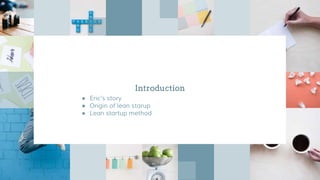 Eric Ries is a Silicon Valley entrepreneur and blogger who developed the lean startup method for companies operating under conditions of extreme uncertainty. The lean startup method advocates validated learning through frequent experimentation using a build-measure-learn process, rather than traditional management techniques. It focuses on building minimum viable products, measuring customer behavior, and using innovation accounting to determine when to pivot or persevere based on experimental results.