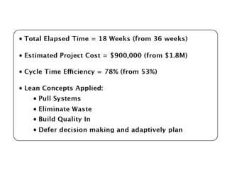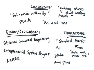 The document discusses the origins and principles of lean thinking, highlighting Toyota's response to crises and its development of the Toyota Production System. Lean methodology focuses on efficiency by eliminating waste, engaging everyone in problem-solving, and emphasizing just-in-time processes. The adoption of lean principles has shown to improve productivity and quality across various sectors, not just in automotive production.