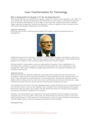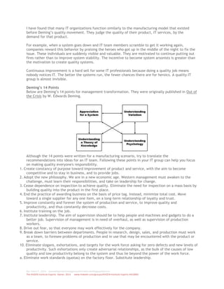 - Deming's 14 Points for management transformation centered on continuous improvement, cooperation across departments, and making quality everyone's responsibility. These principles can guide IT organizations to build quality into systems from the start.