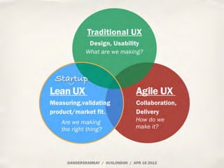 The document summarizes a Lean UX workshop that aims to teach participants practical skills for collaborative team design, lean user research techniques, rapid design tactics to validate assumptions, minimize waste in UX activities, and have fun networking. The agenda includes introductions to Lean UX basics and case studies, as well as two hands-on parts where participants will validate product hypotheses in 60 minutes and raise funds from investors in 90 minutes. The workshop objectives are to encourage cross-functional collaboration, faster innovation, and building the right products through applying Lean UX principles.
