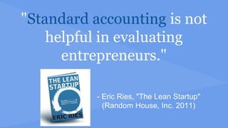 This document discusses lean metrics for startups. It begins by explaining that traditional accounting metrics are not helpful for evaluating entrepreneurs. It then discusses what makes a good metric according to lean startup principles - that metrics should be comparative, understandable, and change user behavior. The document provides examples of lean metrics used at the New York Times and outlines the stages of metrics from empathy to scale. It also discusses how to use metrics when fundraising and what investors look for like active users and revenue potential.