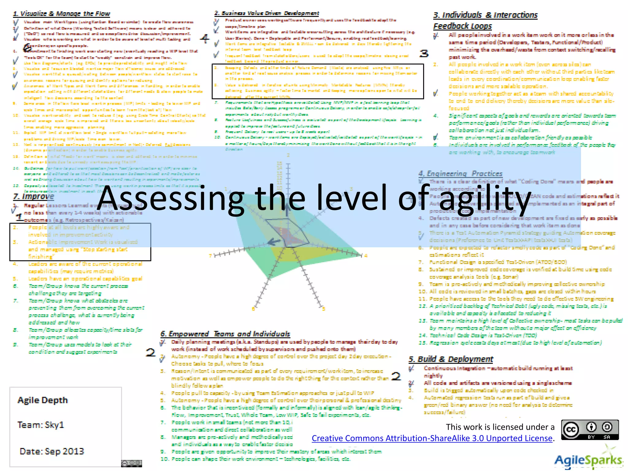 The document outlines the framework for assessing agile and lean capabilities within teams, detailing methods for evaluation, continuous integration, team collaboration, engineering practices, and business value-driven development. It emphasizes the importance of empowering individuals, improving workflows, and maintaining a focus on collective goals to enhance agility and performance. Additionally, it offers strategies for visualizing and managing workflow, encouraging regular improvements, and fostering a collaborative environment to drive sustainable success.