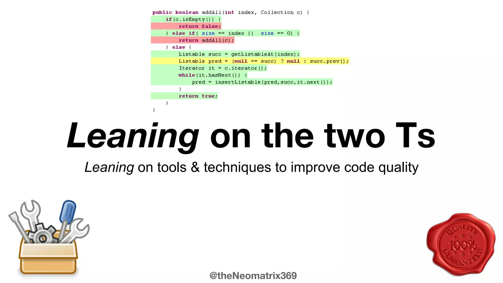 The document shares a personal journey and insights on improving code quality through various tools and techniques. It emphasizes the importance of methodologies such as pair programming, continuous inspection, and refactoring to enhance software development practices. The author also highlights community engagement and collaboration as essential elements for fostering better coding standards and environments.